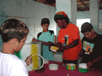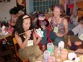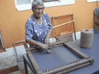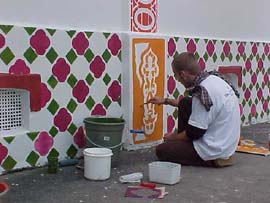 Nenê, agilmente pinta seus quadros em azulejos de cerâmica.